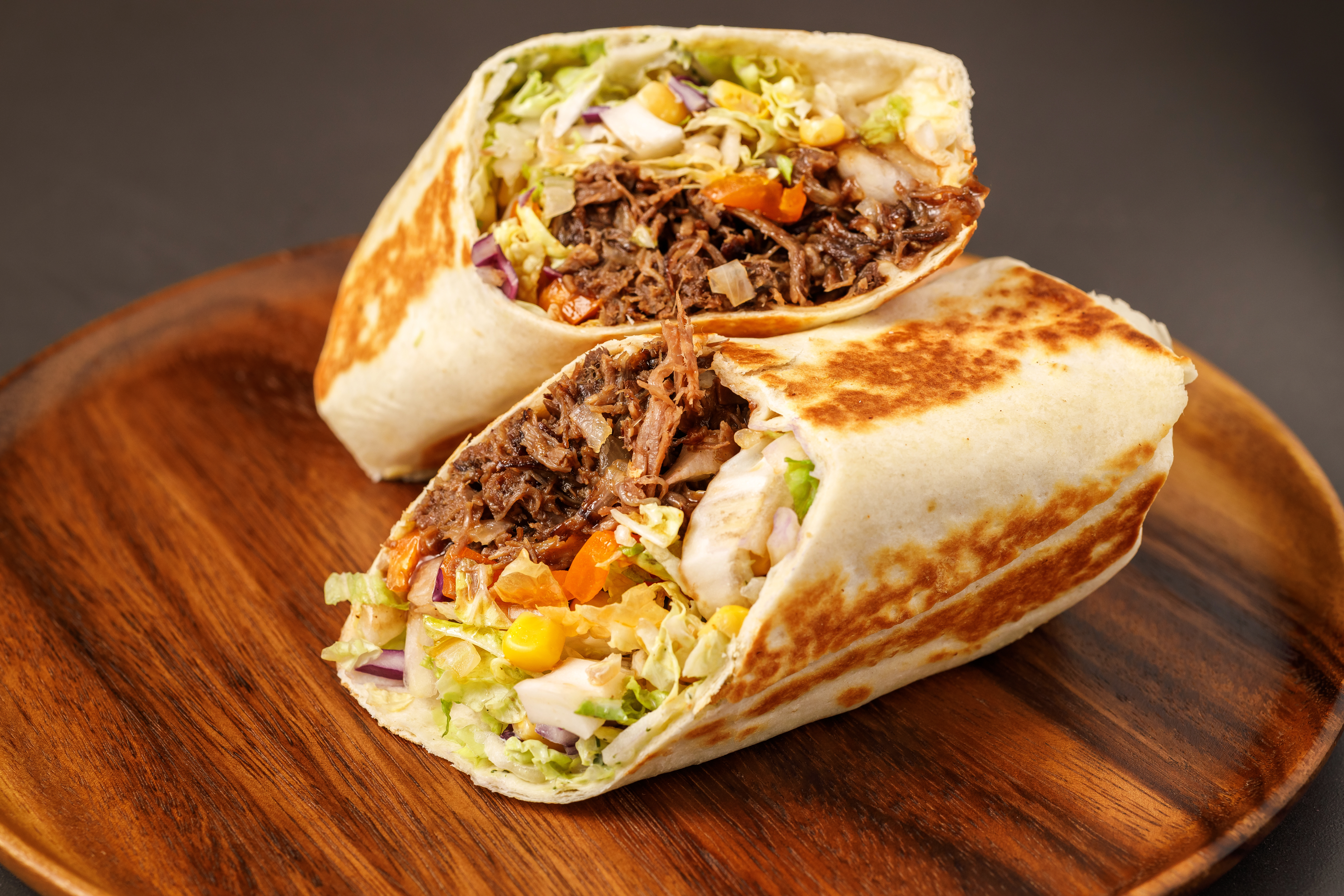 A ground beef burrito filled with pinto beans, salsa, sour cream, burrito sauce, and corn.